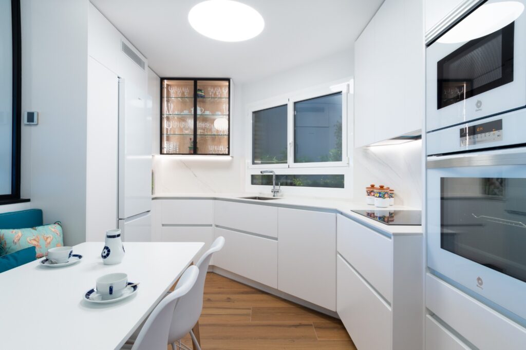 Cocina laminada en blanco sin tirador con Gola de Aluminio. Electrodomésticos blancos y encimera sintética blanca con fregadero integrado. Zona de comedor y separado por mamparas de cristal.