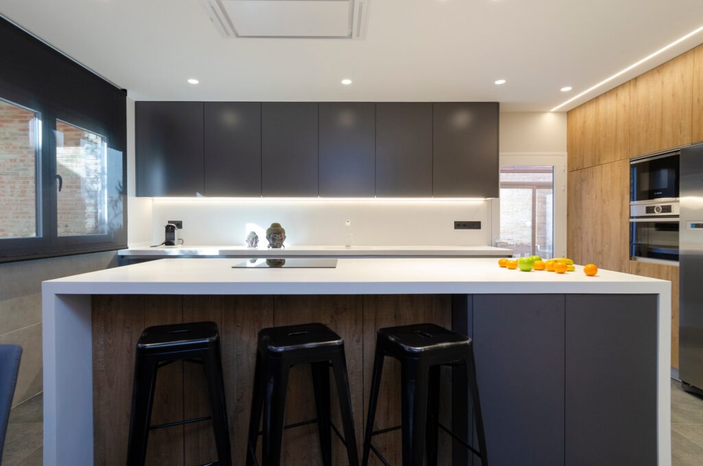 Cocina con gran peninsula que combina el color gris antracita con tonos en madera de cerezo. También se incorpora zona de barra y banquetas.