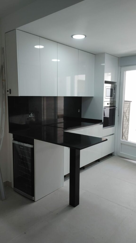 Cocina laminada en blanco sin tirador con Gola de Aluminio. Electrodomésticos blancos y encimera sintética blanca con fregadero integrado. Zona de comedor y separado por mamparas de cristal.