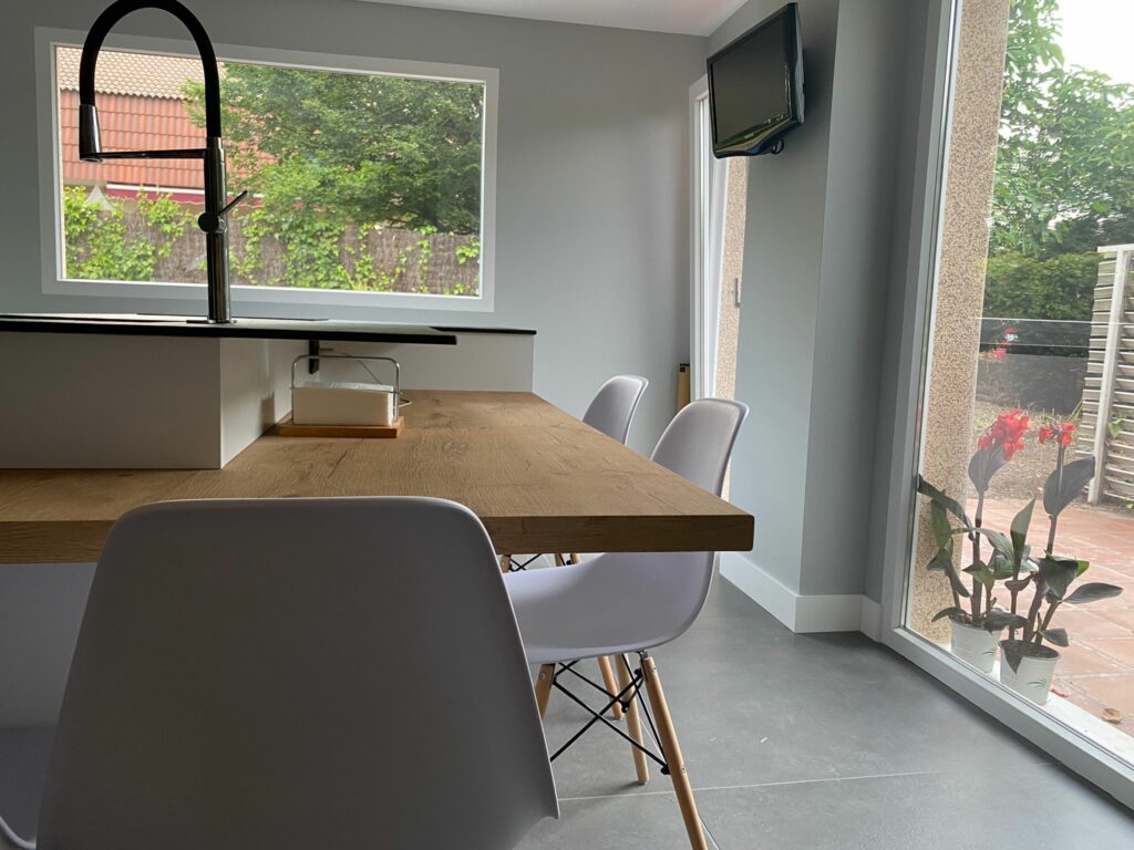 Cocina con gran peninsula que combina el color gris antracita con tonos en madera de cerezo. También se incorpora zona de barra y banquetas.