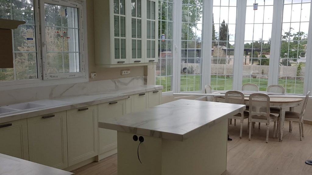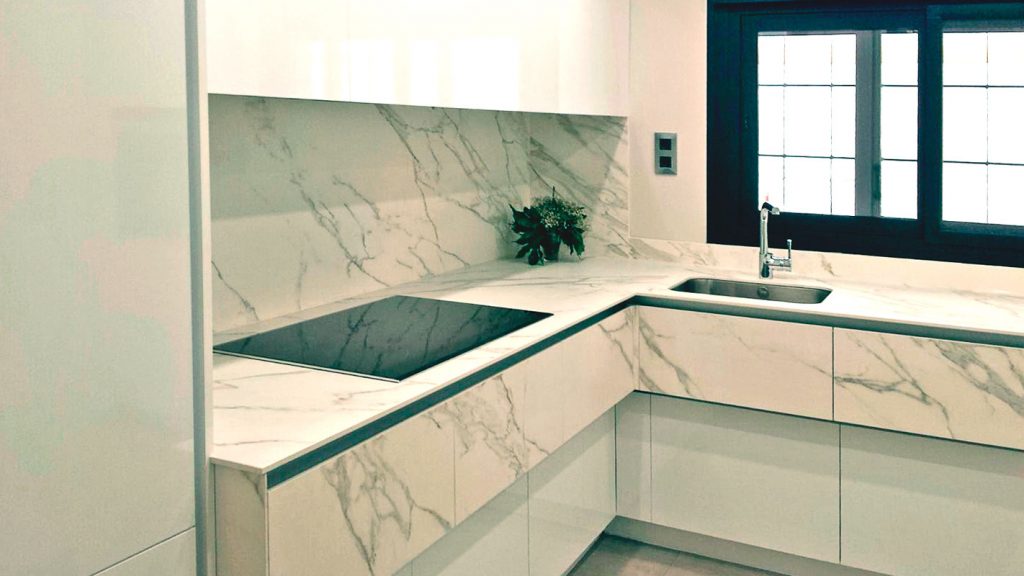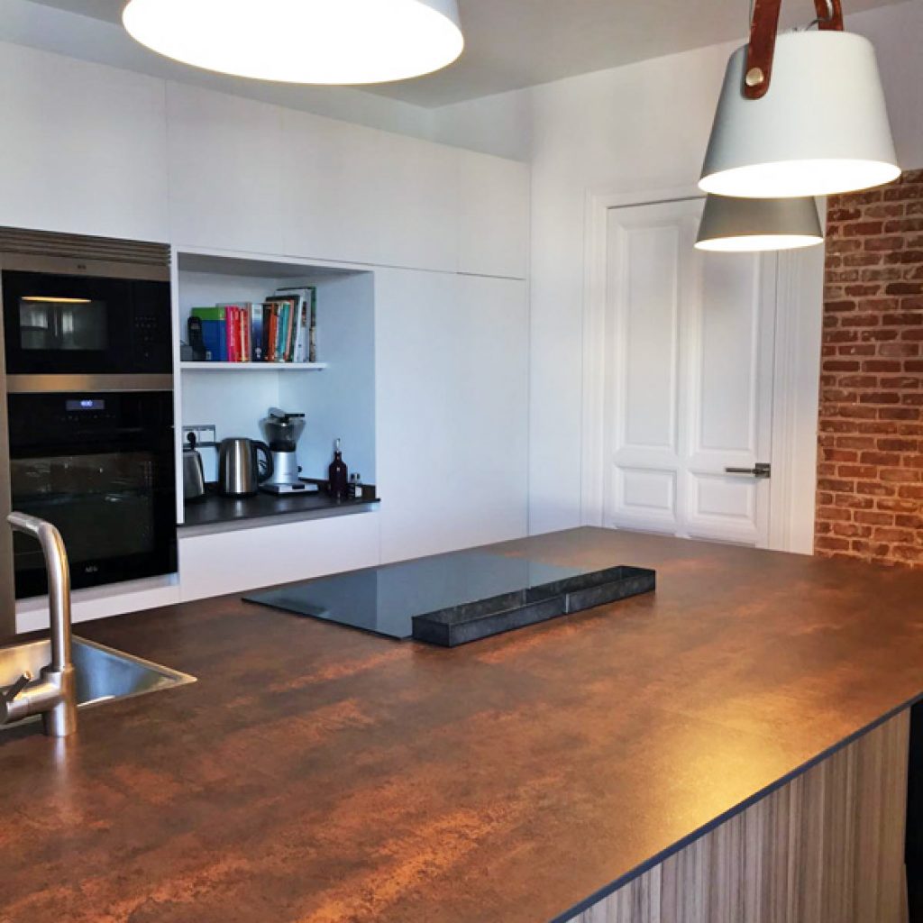 Cocina roja laminada en alto brillo. Encimera- de granito negro. Combinada con electrodomésticos en acero inoxidable. Diseño de cocina a medida con un mostrador bajo y banquetas. Semi columna de horno y microondas.